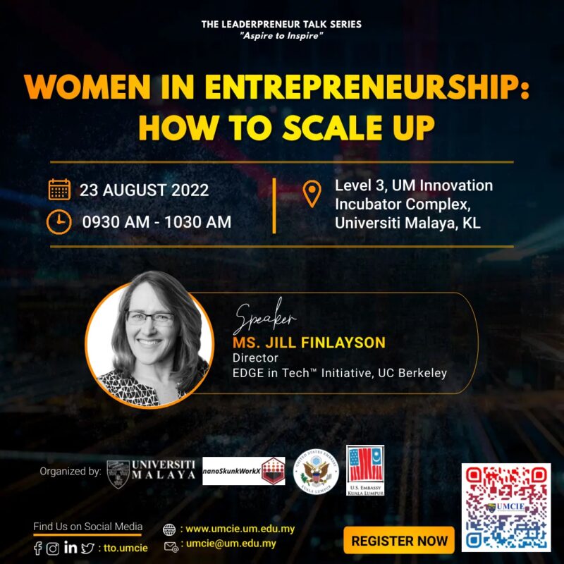 Jill Finlayson will discuss the opportunities and challenges facing women entrepreneurs in their journey. She is the Director of the Expanding Diversity and Gender Equity in Tech (EDGE in Tech™) Initiative at University of California at Berkeley, where she supports research initiatives to promote equitable participation of women and other under-included identities in tech. Prior to Berkeley, she led mentorship and startup programs for Singularity University Ventures, the Toys category at eBay, an online community for Skoll Foundation, marketing at startups, and the World Bank’s Striking Poverty. She speaks on inclusive, impact-oriented innovation, equitable workplaces, and effective leadership. She has mentored global TechWomen, startup founders, and student innovators. Finlayson is a graduate of UC Berkeley. She, hers.